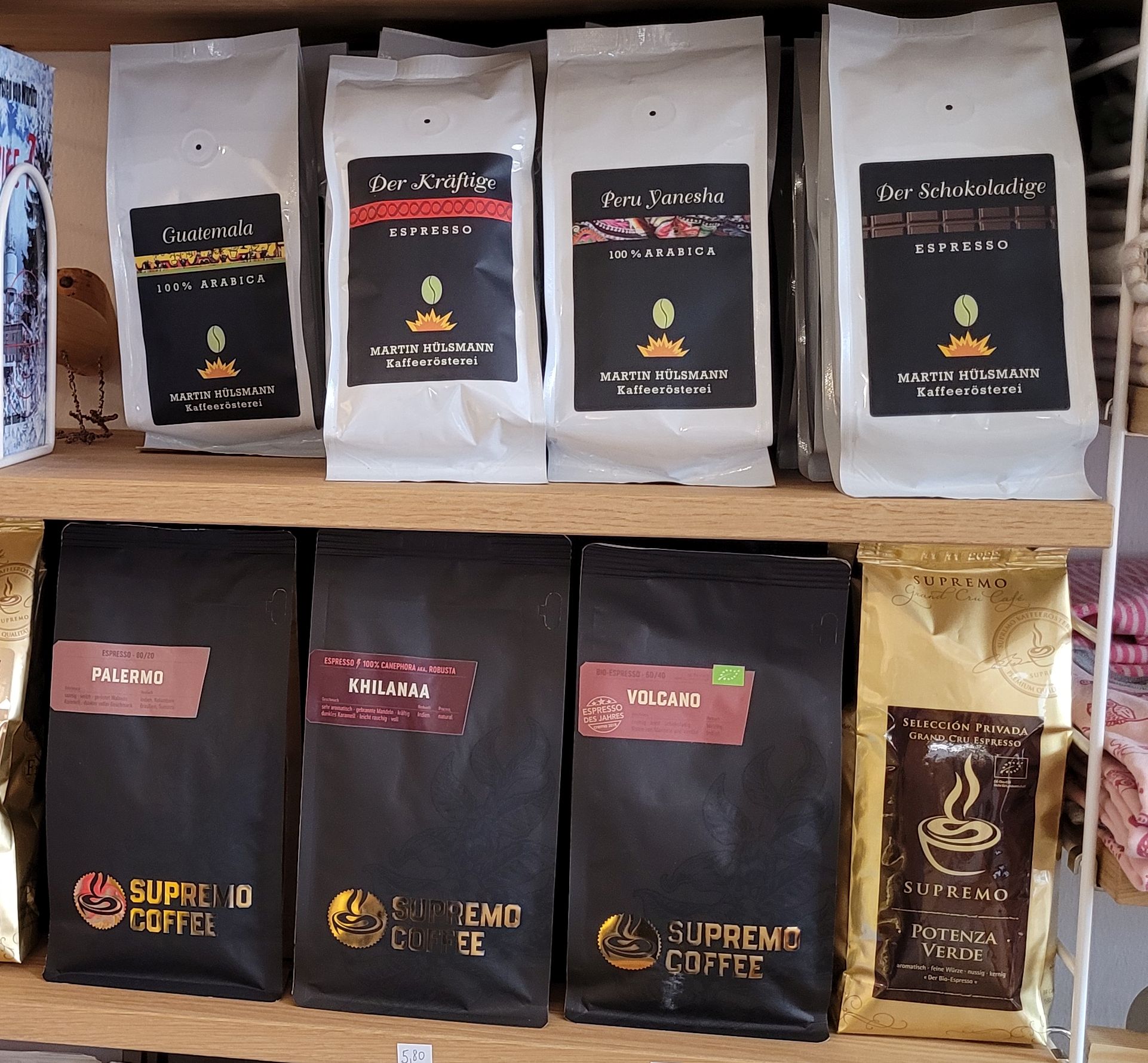 Mit einer Vielzahl unterschiedlicher Sorten sind zwei regionale Anbieter von Kaffeebohnen in unserem Laden vertreten. Zum einen die überregional für ihre Qualität bekannte Unterhachinger Marke Supremo. Zum anderen ein echtes Weilheimer Kaffee-Original: Hülsmann ist der regionale Kaffeeröster schlechthin. Martin Hülsmann röstet direkt in Weilheim, in seinem Cafe M in der Kaltenmoserstraße.