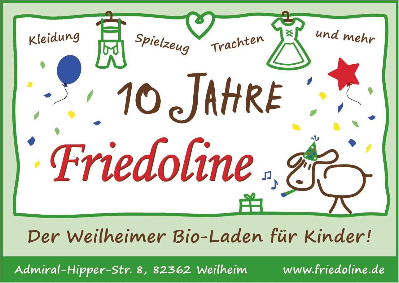 So ist über die Jahre eine kunterbunte Welt für die Kleinsten entstanden, die sich durch die übliche Mundpropaganda, und natürlich reichliches Flyer-Verteilen von Weilheim bis nach Penzberg, Peiting, Starnberg und den Ammersee, immer weiter etabliert hat. Wir, Isabel Radeloff und Torsten Küneth mit unserem Teammitglied Lena Terhar, sind dankbar und glücklich, dass der Aufbruch zur Reise ins Ungewisse vor fünf Jahren uns durch viel Spannendes, kreative Fleißarbeit, tolle Begegnungen und vergleichsweise wenige Untiefen hierher nach 2021 geführt hat. "Die Welt ein bisschen verschönern" war unsere Motivation - und wir hoffen, dass uns das in der zweiten Hälfte des erstn Friedoline-Jahrzehnts weiterhin so gelingt. Herzlichen Dank allen Kund*innen und Freund*innen, die wir bisher schon gewinnen durften, für Ihre und Eure Treue! Und übrigens: Die kleine Party vom Dreijährigen wird zum Fünfjährigen natürlich auch wiederholt - sobald es möglich ist und in leicht veränderter Form. Mehr zu gegebener Zeit.