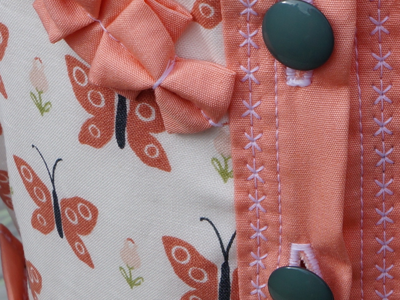 Ein Kunststich in Blütenform oder mehrfarbige Stickränder verzieren die Knopfleiste, oder das Schleifchen, mit dem die Schürze des Babydirndls gebunden wird. Ausgesuchte Stoffmuster mit Blüten, Schmetterlingen und vielem mehr geben dieser festlichen Babykleidung ihre Einzigartigkeit. Auch der Rüschenkragen ist sorgfältig für jedes Babydirndl individuell eingenäht.