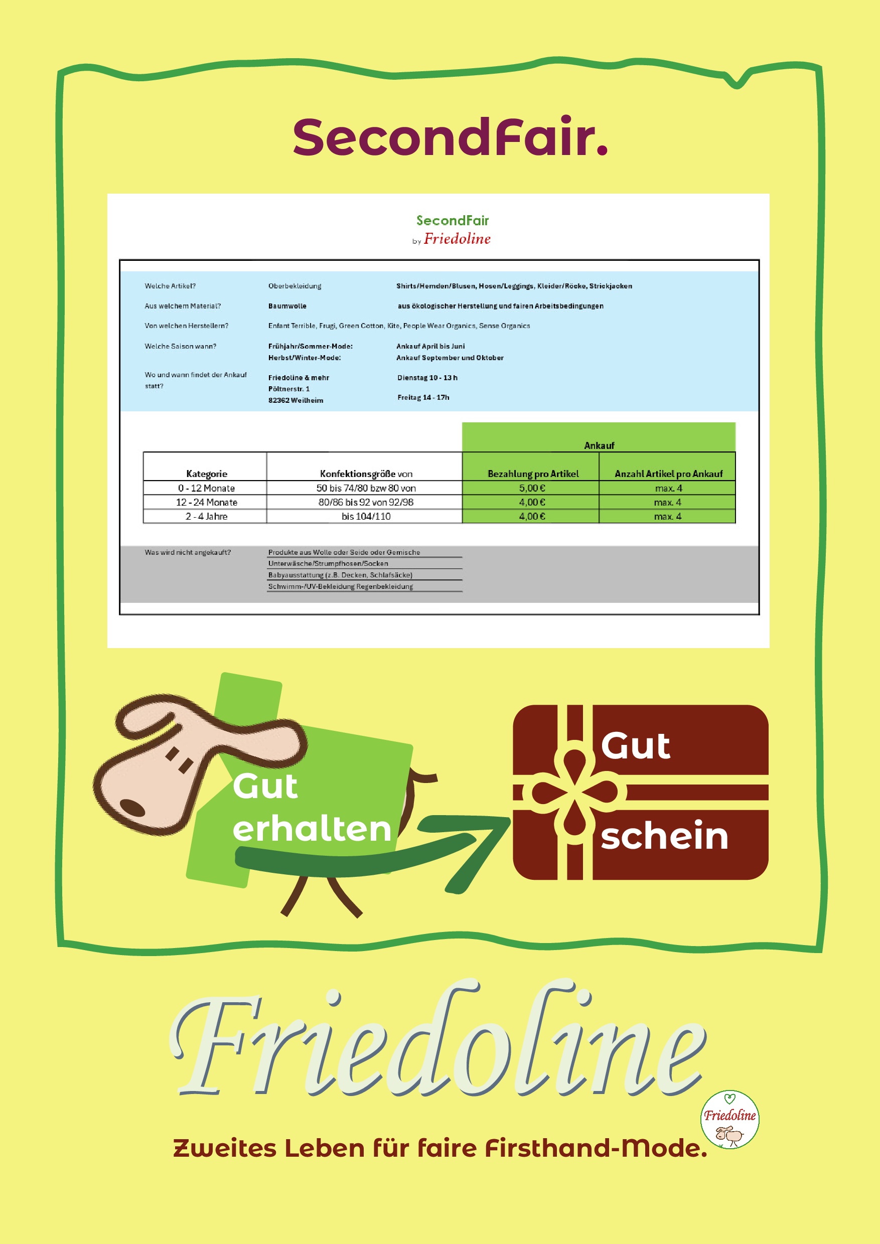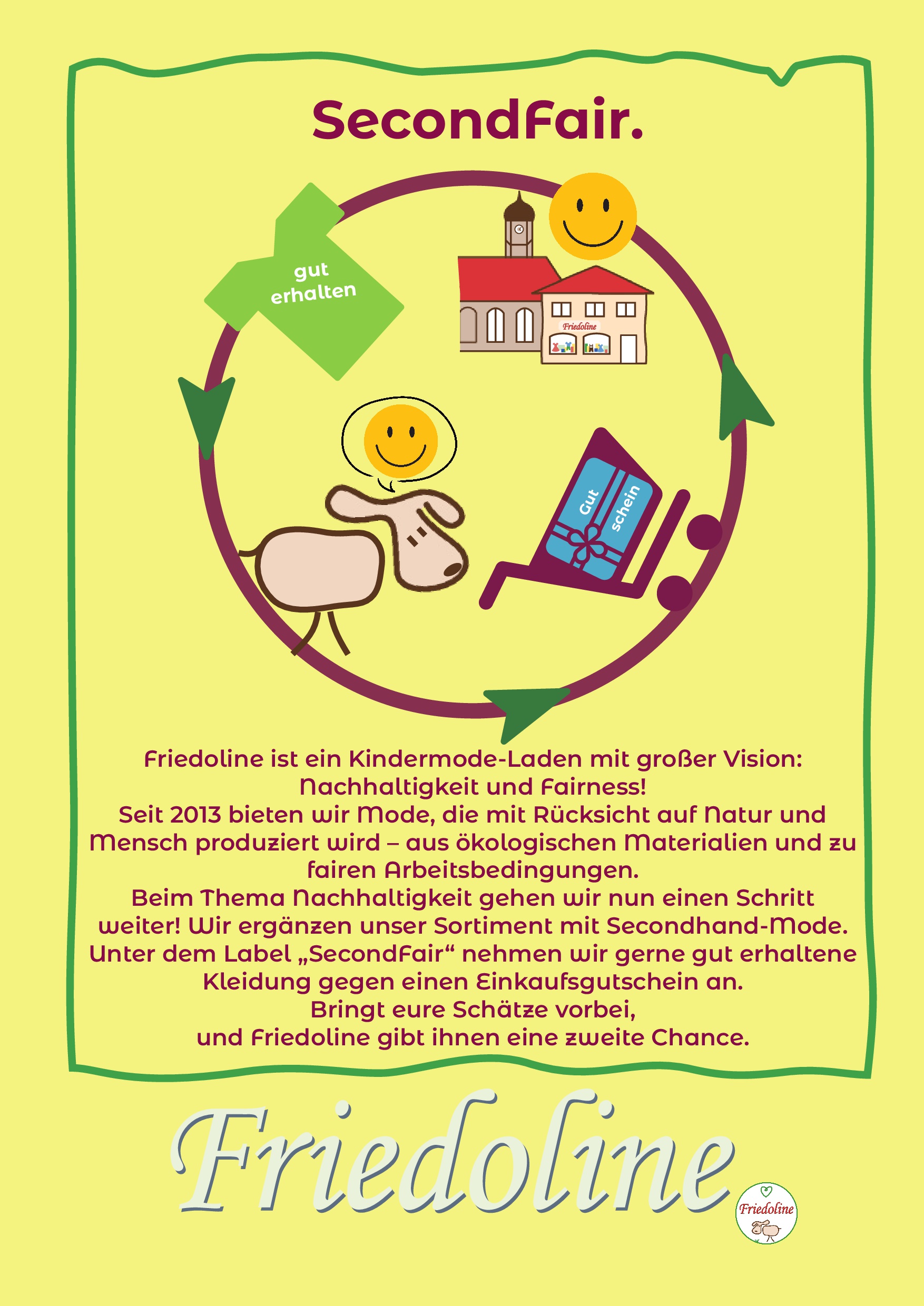 Beim Thema Nachhaltigkeit gehen wir nun einen Schritt weiter! Wir ergänzen unser Sortiment mit Bio-Secondhand-Mode für Kinder. Unter dem Label „SecondFair“ nehmen wir gerne gut erhaltene Kleidung gegen einen Einkaufsgutschein an. Bringt eure Schätze vorbei, und Friedoline gibt ihnen eine zweite Chance.